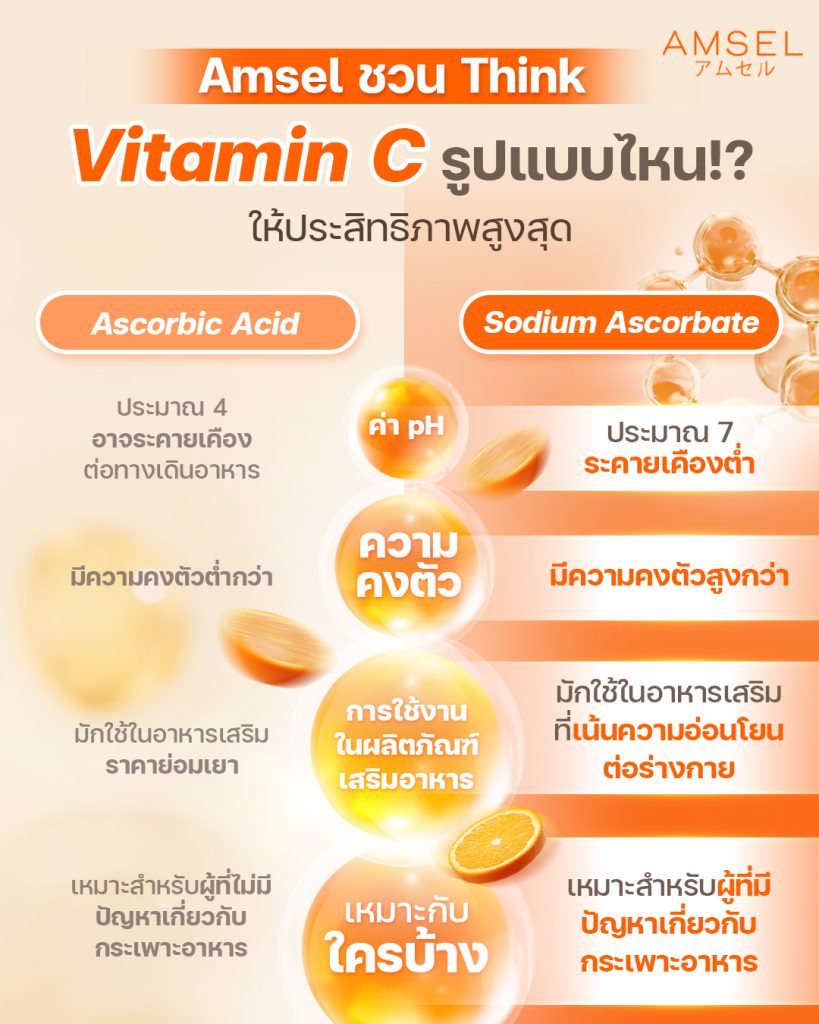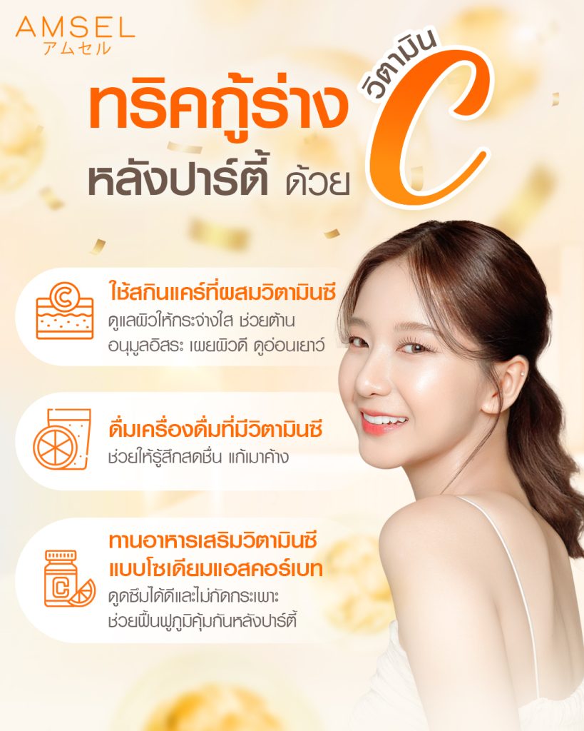 ปาร์ตี้หนักไม่พัก! ทำร่างพัง ผิวพรรณเริ่มโทรมบูสต์ด้วย Vitamin C ตัวช่วยดีๆ ให้คุณกลับมาสดใส ไม่มีอ่อม! ไม่มีอ๊อง! ออร่ากลับมาเปล่งประกายเหมือนเดิม ใช้สกินแคร์ที่ผสมวิตามินซี ดูแลผิวให้สม่ำเสมอมีความกระจ่างใส เพิ่มความชุ่มชื้น กระตุ้นคอลลาเจน และเพิ่มอีลาสตินใต้ผิวหนัง ให้มีความกระชับ ฟื้นฟูความหมองคล้ำได้ดี ดื่มเครื่องดื่มที่มีวิตามินซี ช่วยให้รู้สึกสดชื่น แก้เมาค้าง เช่น น้ำส้ม ทำให้รู้สึกสดชื่น และกำจัดปริมาณแอลกอฮอล์ในร่างกาย ทานอาหารเสริมวิตามินซี ฟื้นฟูระบบภูมิคุ้มกันให้ทำงานเป็นปกติ บำรุงผิวจากภายใน ช่วยจัดการปริมาณอนุมูลอิสระ เผยผิวดี ยืดหยุ่น ดูอ่อนเยาว์ แนะนำให้เลือกเป็นวิตามินซีในรูปแบบ ‘โซเดียมแอสคอร์เบท จะดูดซึมได้ดี และไม่กัดกระเพาะ Amsel พร้อมดูแลสุขภาพของคุณอย่างใส่ใจ มอบคุณประโยชน์จากภายในสู่ภายนอก *ไม่มีผลในการป้องกัน หรือรักษาโรค*ควรกินอาหารหลากหลายครบ 5 หมู่ในสัดส่วนที่เหมาะสมเป็นประจำ ช้อปได้ทาง Online และร้านค้าหรือร้านขายยาชั้นนำทั่วประเทศLINE@ : @amselหรือ line.me/ti/p/@amselShopee : https://s.shopee.co.th/1LRAhmv2TVLazada : https://s.lazada.co.th/s.uJWX6