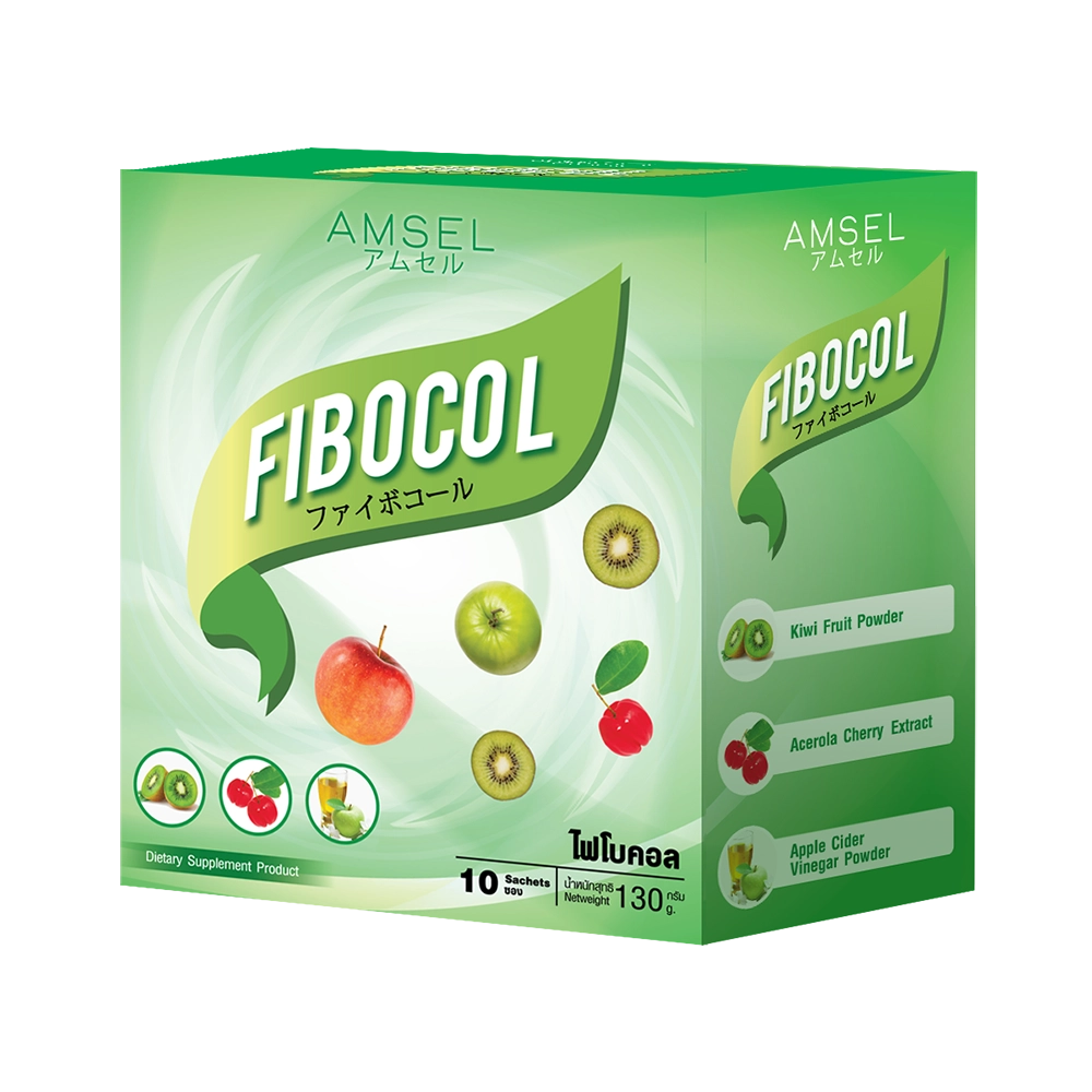 Amsel Fibocol ผลิตภัณฑ์เสริมใยอาหารที่รวมใยอาหารจากธรรมชาติหลายชนิด เช่น Fructooligosaccharide, Psyllium Husk, ผงกีวี และผงแอปเปิ้ลไซเดอร์ ร่วมกับสารสกัดจากพืช ผลไม้ และวิตามินที่มีส่วนช่วยดูแลระบบทางเดินอาหาร เหมาะสำหรับผู้ที่ใส่ใจสุขภาพการขับถ่ายในชีวิตประจำวัน ชงละลายง่าย รสแอปเปิ้ลเขียวและกีวี่ รับประทานสะดวก