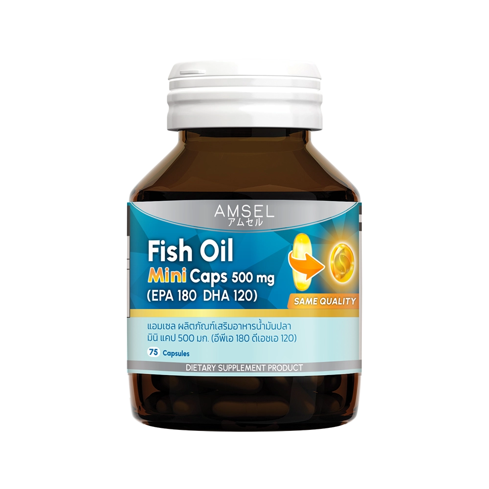 Amsel Fish Oil Mini Caps 500 mg. เป็นผลิตภัณฑ์เสริมอาหารที่ให้กรดไขมันโอเมก้า-3 จากน้ำมันปลาคุณภาพดี โดยให้ EPA และ DHA ซึ่งเป็นกรดไขมันจำเป็นที่ร่างกายไม่สามารถสร้างเองได้ พร้อมมาในรูปแบบซอฟต์เจลแคปซูลขนาดเล็กที่พัฒนามาจากสูตรเดิม Fish Oil 1,000 mg. โดยคงคุณภาพของกรดไขมันโอเมก้า-3 ที่ให้ EPA 180 mg และ DHA 120 mg เท่าเดิม แต่ปรับขนาดแคปซูลให้เล็กลงเพื่อให้รับประทานง่ายขึ้น เหมาะสำหรับผู้ที่ไม่สะดวกกลืนแคปซูลขนาดใหญ่ โดย EPA และ DHA ในผลิตภัณฑ์มีบทบาทสำคัญในการดูแลระบบไหลเวียนโลหิตและการทำงานของสมอง จึงเหมาะกับผู้ที่ต้องการดูแลสุขภาพโดยเฉพาะในเรื่องระบบไหลเวียน การทำงานของร่างกายโดยรวม และการดูแลร่างกายจากภายใน
