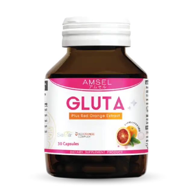 Amsel Gluta Plus Red Orange Extract เป็นผลิตภัณฑ์เสริมอาหารที่รวมกรดอะมิโนสำคัญ ได้แก่ L-Glutathione, L-Cysteine, L-Glutamine และ Glycine ซึ่งมีส่วนช่วยในการสร้างสารต้านอนุมูลอิสระในร่างกาย เสริมด้วยสารสกัดจาก Citrus sinensis (ส้มสีเลือด) ซึ่งเป็นแหล่งของสารกลุ่มโพลีฟีนอลและวิตามินตามธรรมชาติที่มีบทบาทในการดูแลผิวและสุขภาพโดยรวม