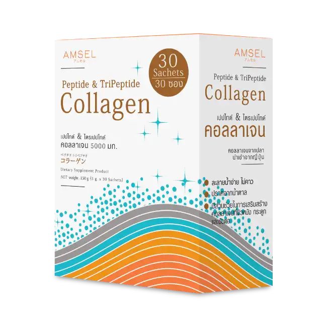 Amsel Peptide & Tri Peptide Collagen 5,000 mg. ผลิตภัณฑ์เสริมอาหารที่รวมคอลลาเจนคุณภาพสูง 3 ชนิด ได้แก่ Nippi Collagen Peptide จากประเทศญี่ปุ่น ที่ผ่านกระบวนการไฮโดรไลซ์ให้มีโมเลกุลขนาดเล็ก ช่วยให้ร่างกายดูดซึมได้ดี คอลลาเจนไตรเปปไทด์ที่ผ่านการย่อยด้วยเอนไซม์ และไฮโดรไลซ์คอลลาเจน ผสานกับไฮยาลูรอนิก แอซิด เพื่อเสริมการดูแลความชุ่มชื้นและความยืดหยุ่นของผิว พร้อมสนับสนุนสุขภาพข้อต่อและกระดูกอย่างสมดุล ผลิตภัณฑ์อยู่ในรูปแบบผง ใส ไม่มีสี ไม่มีกลิ่น สามารถผสมกับเครื่องดื่ม อาหาร หรือขนมหวานได้ตามต้องการ เหมาะสำหรับผู้ที่ใส่ใจการดูแลสุขภาพผิวและข้อต่อในชีวิตประจำวัน
